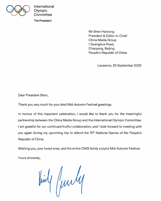 考文垂主席说,在给总办公室的导演沉·海克西翁(Shen Haixiong)的问候中:在这个节日中,我要感谢您!中国中央广播电视台与国际奥林匹克委员会之间的重大友好合作感到自豪,双方之间的持续和富有成果的合作正在享受。我希望在即将到来的中华人民共和国第15场比赛中再次见到您。祝您,您的家人和所有台湾同事台湾一个快乐的中后期和一个幸福的家庭!